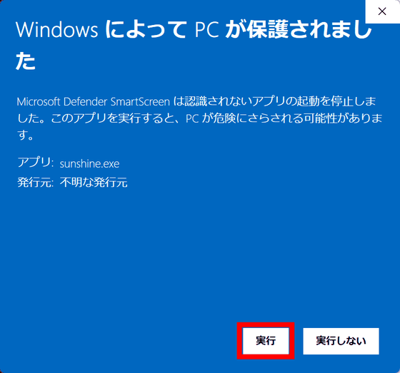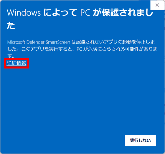 保護機能の警告が表示される場合は「詳細情報」をクリック。