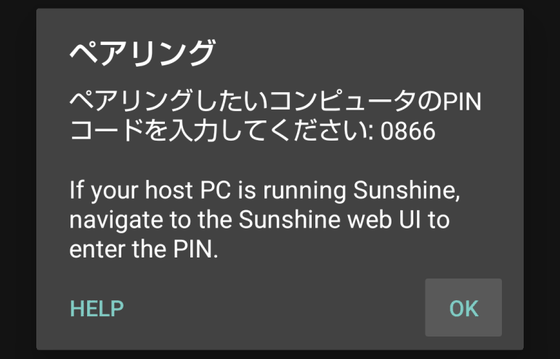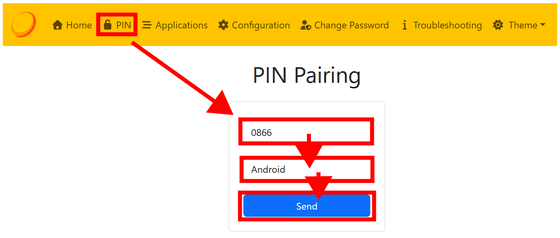 ホスト側の管理画面メニューから「PIN」をクリックし、クライアントに表示されているペアリング用のPINコードとクライアントのデバイス名を入力して「Send」をクリック。