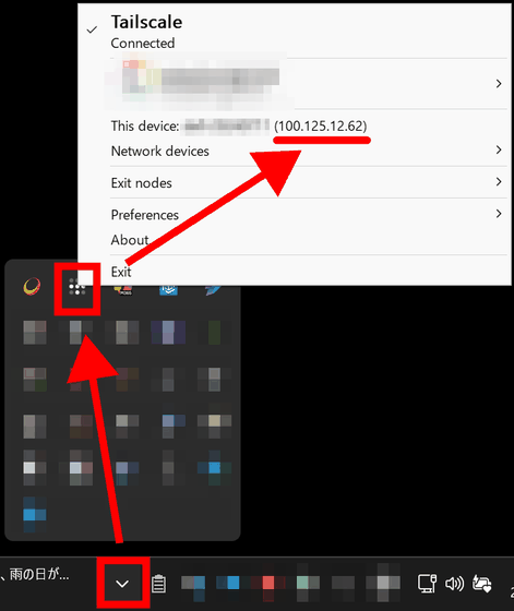 クライアントからの接続に必要なVPN上のホストのIPアドレスを確認するため、タスクトレイのTailscaleアイコンを右クリックして「This device」で表示されているIPをメモしておきます。