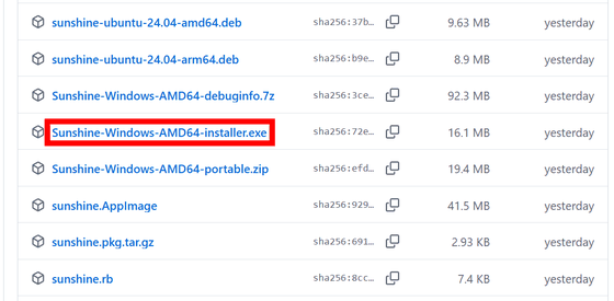 ホストPCに配信サーバーをインストールするためSunshineのReleasesページのAssetsからWindows用のインストーラーをダウンロードします。