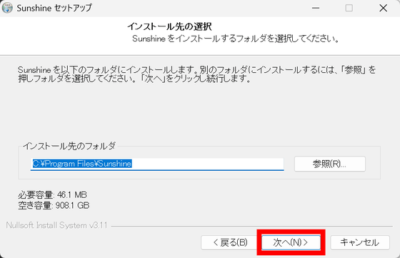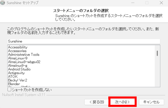 スタートメニューに登録する場合は、そのまま「次へ」をクリック。