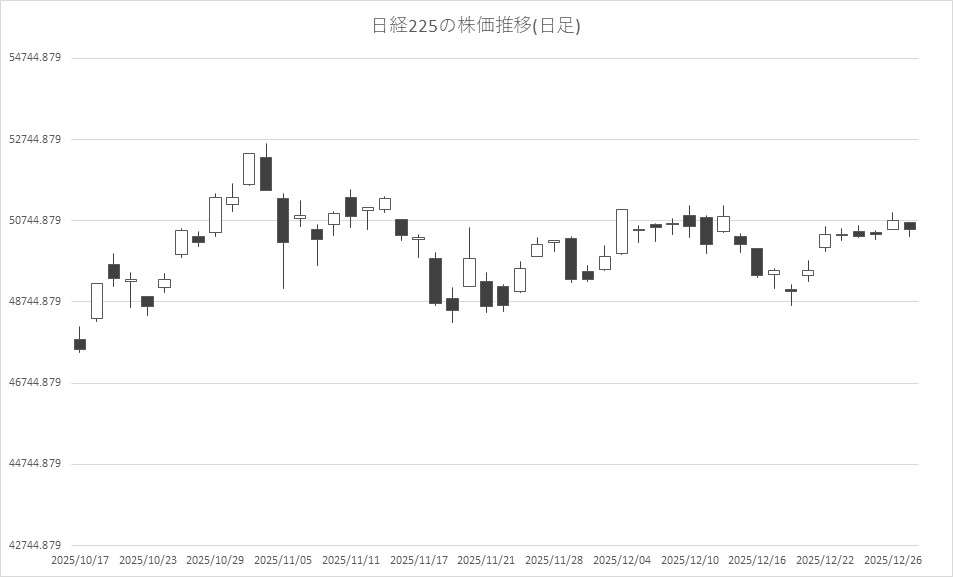 12月29日の東京株式市場は反落。日経平均株価は、前営業日比223円47銭安の5万0526円92銭でこの日の取引を終えた。12月末の配当権利落ちに伴う下落で始まり、一時は402円安まで下げる場面があった。年末で市場参加者が少なく方向感のない展開が続いたものの、一部はショートカバーが入って底堅い動きを示した。