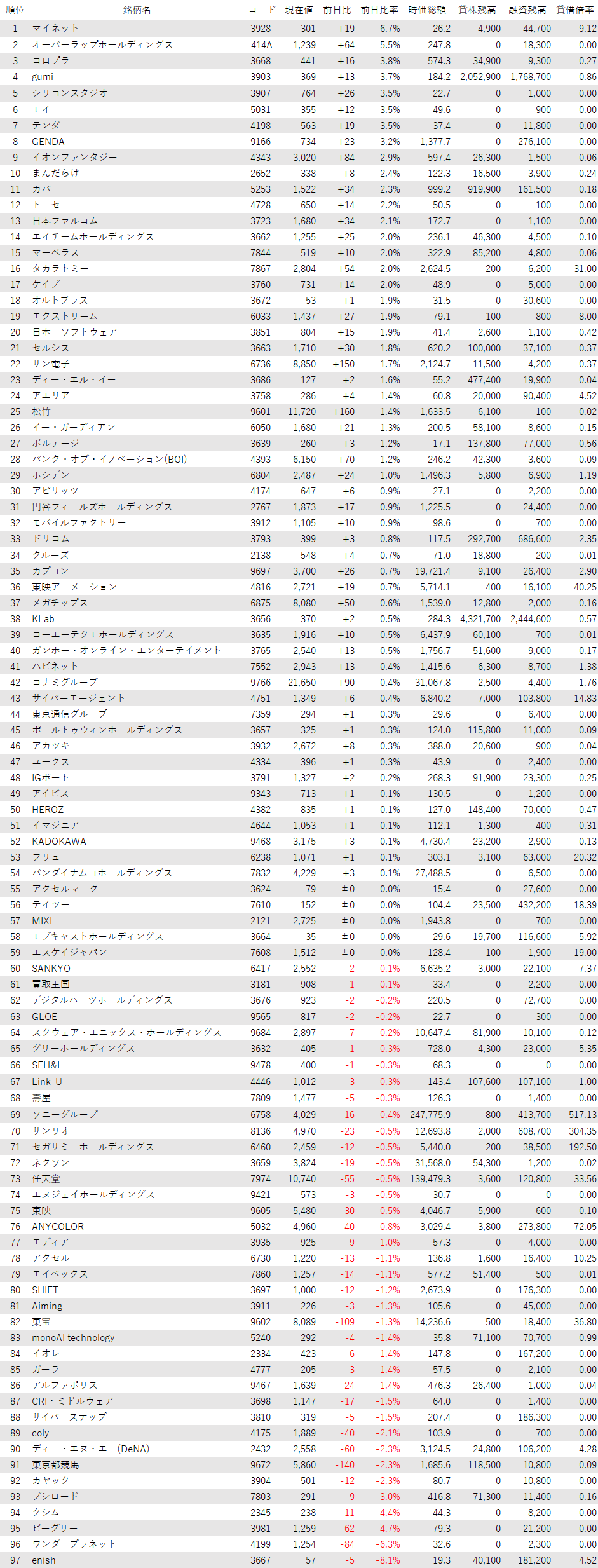 こうしたなか、ゲーム・エンタメ関連企業をみると、登録されている97銘柄のうち、上昇は54銘柄(56%)、下落は38銘柄(39%)、変わらずは5銘柄(5%)で、買い優勢だった。