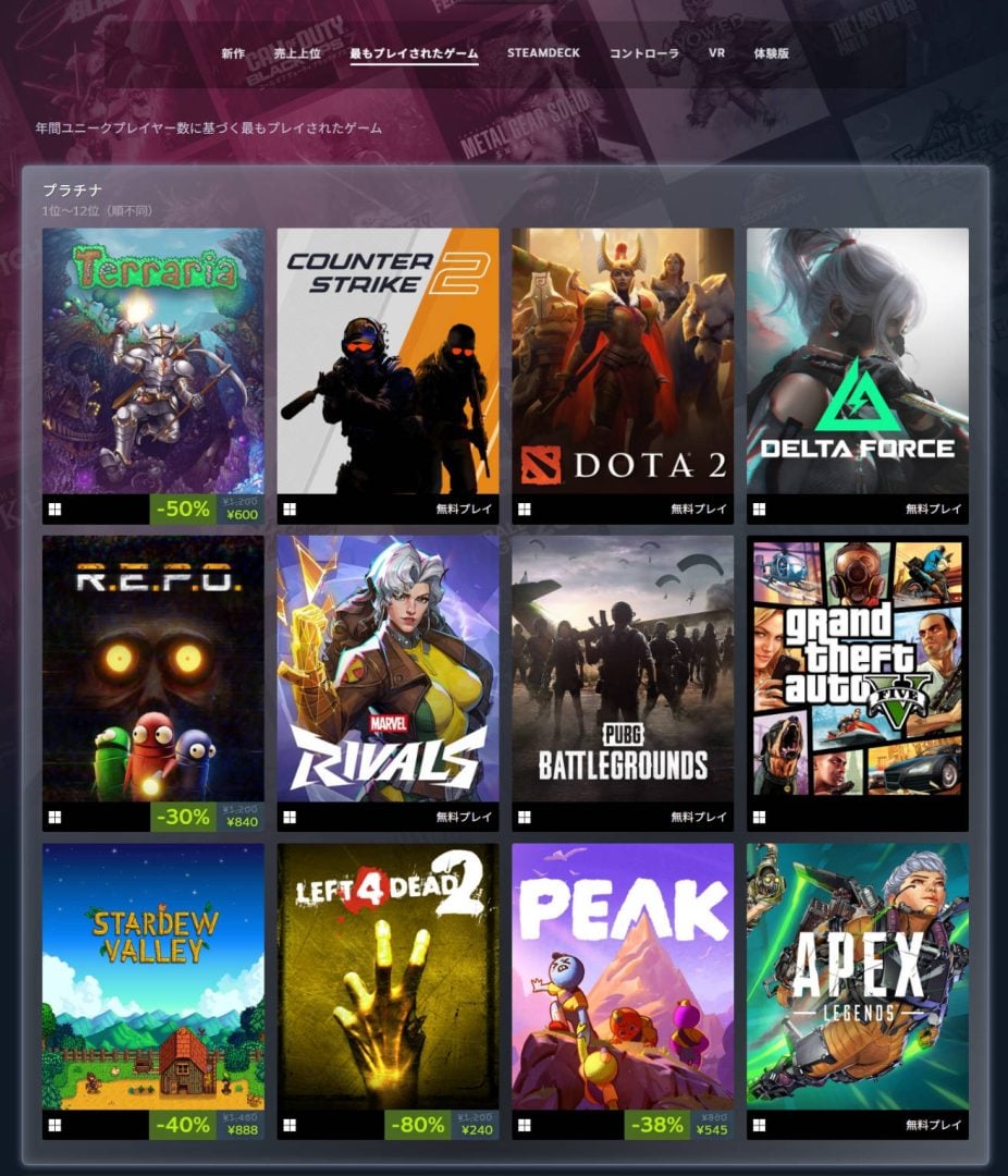 同カテゴリでは基本プレイ無料作品が強さを見せ、先述の『Counter-Strike 2』や『PUBG: BATTLEGROUNDS』『Apex Legends』などがプラチナ入り。また2024年12月にリリースされた『マーベル・ライバルズ』『Delta Force』もプラチナに名を連ねている。そのほかでは『R.E.P.O.』『PEAK』と、2025年に人気を博した協力プレイゲームもプラチナに登場。プレイヤー数の多さがうかがえる結果となっている。