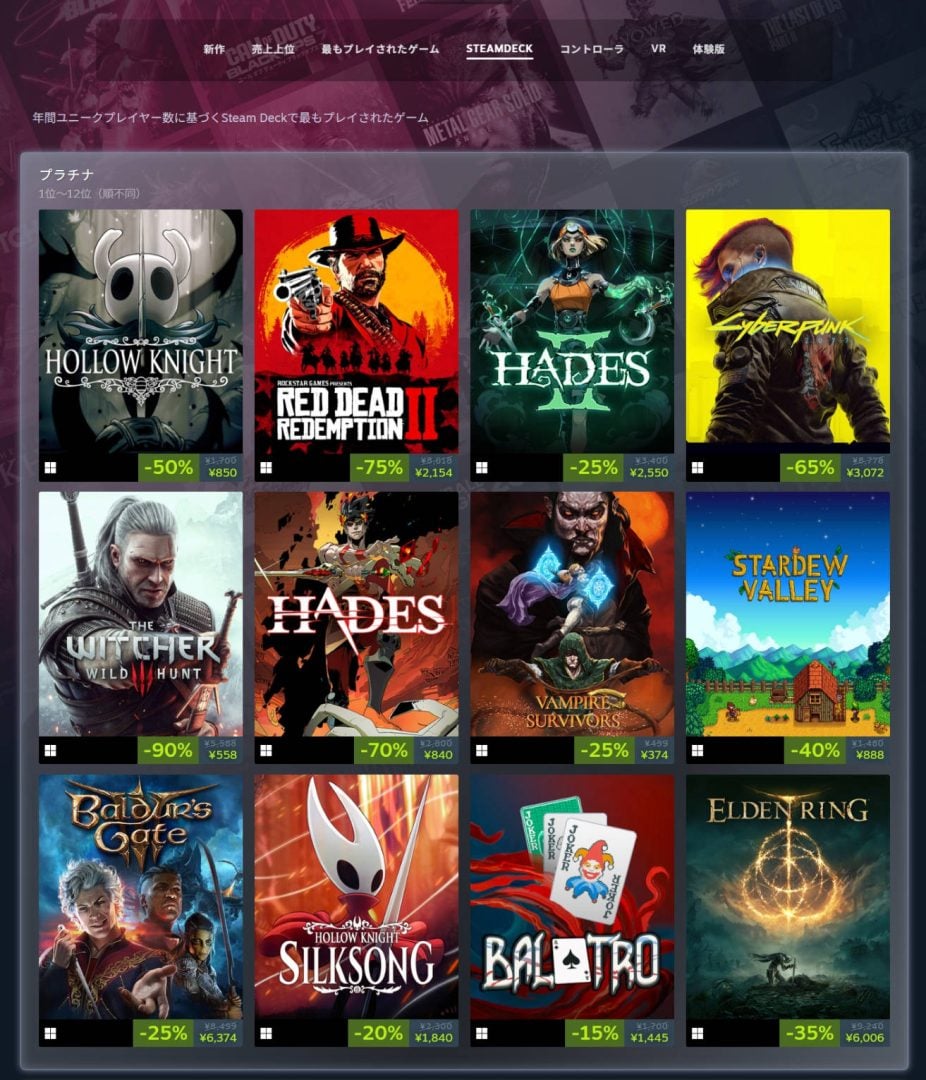 そのほか「Steam Deck」カテゴリでは、Steam Deckでプレイされた年間ユニークプレイヤー数が集計。このカテゴリでは公式のSteam Deck対応の認証の有無は関係なく、Steam Deckでプレイされていることが確認されたタイトルがリスト入りしているそうだ。そんな同カテゴリでは『Hollow Knight』と『Hollow Knight: Silksong』および『Hades』『Hades II』と、シリーズ作品が揃ってプラチナ入り。両シリーズは新作が今年正式リリースされており、Steam Deckで過去作からまとめてプレイする人が多かったのかもしれない。