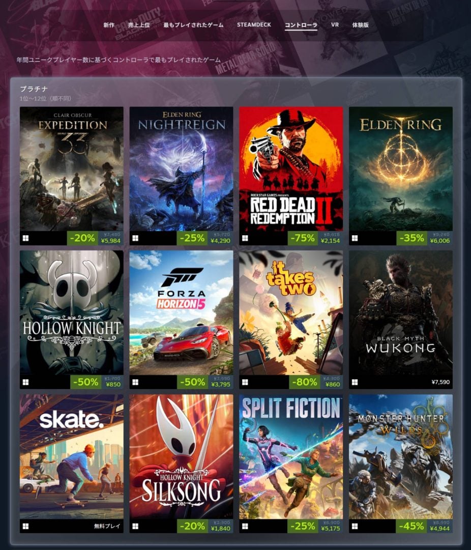 「コントローラ」では、その作品をコントローラーでプレイしたユニークプレイヤー数に基づくカテゴリが紹介されている。「最もプレイされたゲーム」と比較すると、『Counter-Strike 2』などのシューティングゲームがランクを落としている一方で、『ELDEN RING NIGHTREIGN』や『モンスターハンターワイルズ』といったアクションゲームがプラチナに登場している。アクション要素の強い作品はキーボードとマウスよりも、コントローラーで遊ぶ人が多いことがうかがえる結果である。