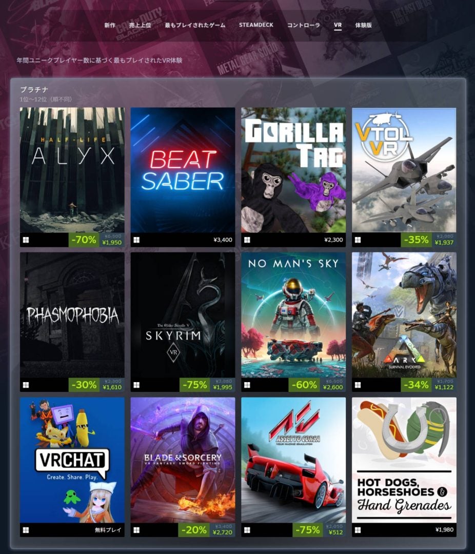 また「VR」カテゴリは『Beat Saber』など昨年と重複するものも多いが、『VRChat』が新たにプラチナ入りしている。『VRChat』はSteamにおける同時接続プレイヤー数を年々着実に伸ばしており、今年とうとうプラチナに名を連ねたかたちとなったようだ。