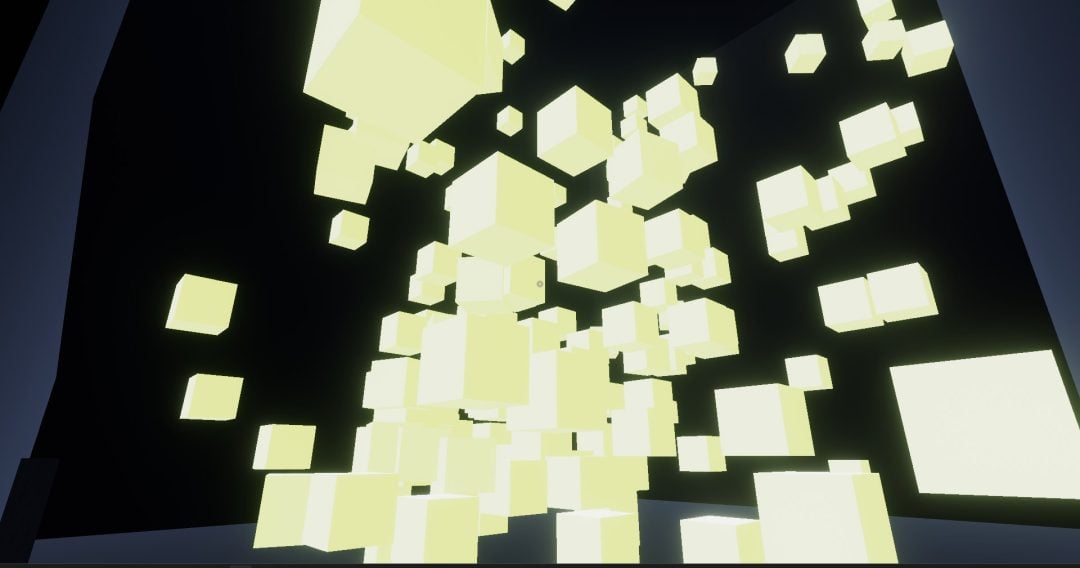 単語彫刻美術館は単純に言えば「館内に設置されているオブジェを見て、それが表す英単語を答える」というパズルワールドである。このワールドは作者であるcompetor氏による厳密な「パズルかくあるべし」という信念のもと制作されており、「アルファベットの形と順番以外の一切の事前知識を必要としない」という厳しいルールが存在する。答えが実在する英単語である以上英語の知識が有利に働く場面は多々あるが、基本的には閃き一本勝負の問題が多く、どれも実に苦しく美しい。そして添付のスクリーンショットは本館と別館、計100問のパズルの中で筆者がもっとも苦戦した問題である。なお題名として見た目から勝手に「タンパク質の分解」と名付けていた。このパズルではこの黄色い立方体の乱雑な集合体が特定の英単語を表しており、しかも回答に一切の事前知識は必要ないというのだ。意味が分からないと思うだろうが、実際に意味が分からなかった。夢にまで出てくるのではないかというくらい苦戦したのだが、ある時突然「降りてきた」。あの衝撃は筆舌に尽くしがたい。頭がおかしくなるかと思うくらい悩んだが、パズルというのは解けるとその分気持ちよくなれるものだ。個人的に『VRChat』屈指のクオリティを誇るワールドなので、ぜひ自分でも味わいに行ってほしい。
