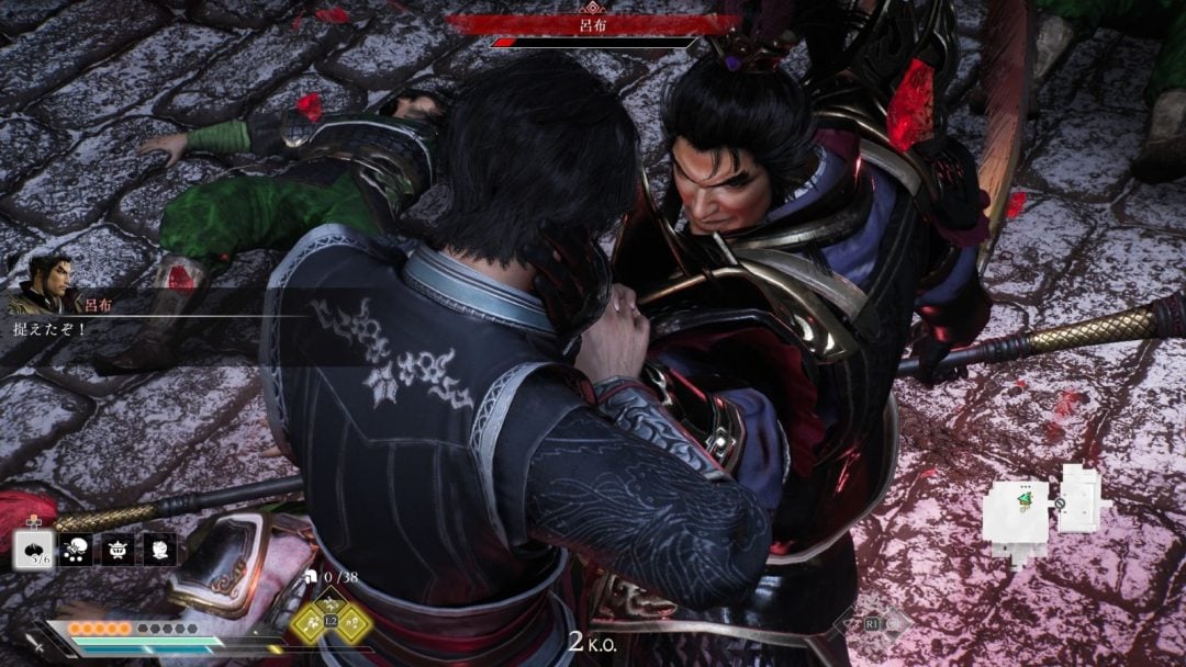 呂布が待ち構えるフィールドでは赤兎馬がまず雑兵をなぎ倒していく。呂布を馬から引きずり下ろしたところで、空中から突進、地上では弓の連撃、地面を叩けば全方位に波動を飛ばす。挙句の果てには格闘ゲームの“コマンド投げ”かと勘違いするほどの痛烈な投げをお見舞いしてくる。気づけば味方の武将も敗走し、1対1になっている。幸い本作にはジャスト回避や弾き返しもあるものの、一度攻撃を食らえば数割の体力とのトレードは覚悟せねばならない。手持ちの肉まんが尽きれば、ステージの隅に駆けていき肉まんを探す、まるで“あの頃”のような光景が繰り広げられる。再戦の仕様により、ある程度の体力割合からやり直せるのは嬉しいが、その仕様に喜ぶということは、つまりそれは何度も呂布に倒されている、ということでもある。