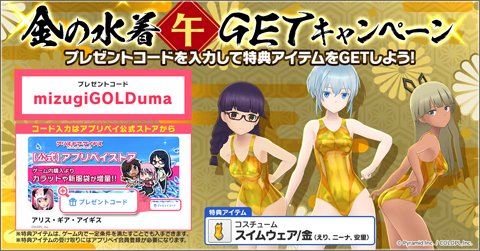 また、「アリスギア公式アプリペイストア」にて、アクトレス3人分の「金の水着」がもらえるキャンペーンも実施中です。
