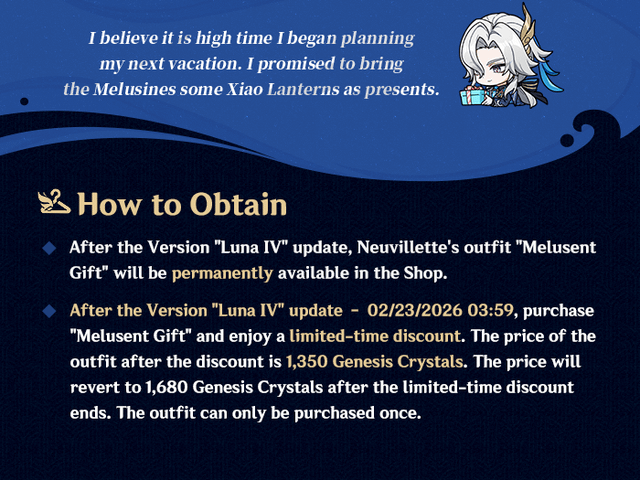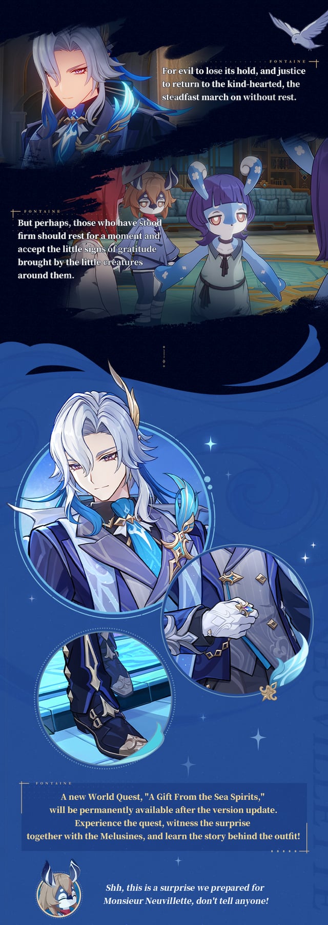 こんにちは旅行者~ ヌーヴィレットの新しい衣装 "メルーセントギフト" バージョン以降で利用可能になります "ルナⅣ" アップデート! トラベラーズはキャラクター衣装ショップで購入可能!衣装の詳細をチェックしてみましょう~ by genshinimpact