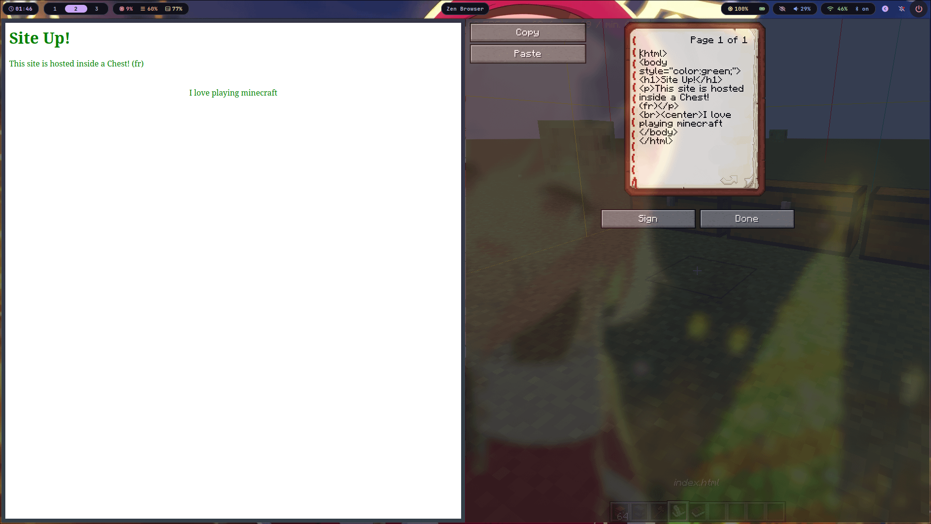 別の日、別のアイデア、今ならできます ウェブサイトをホストする マインクラフトを使って 本と羽根ペンとチェスト! 共有できる機能を追加しようと考えています ゲーム内 のようなデータ 近くのエンティティ、プレイヤー数、テキストメッセージの内容など。 他に何か思いつきますか? この投稿で良い反応が得られたら、これを GitHub でオープンソースにするかもしれません :3 by X3r0DayHQ
