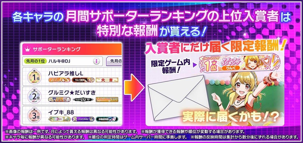 月間での集計となるサポーターランキングでは、上位入賞したサポーター(プレイヤー)に対し、さまざまな特典が用意されています。