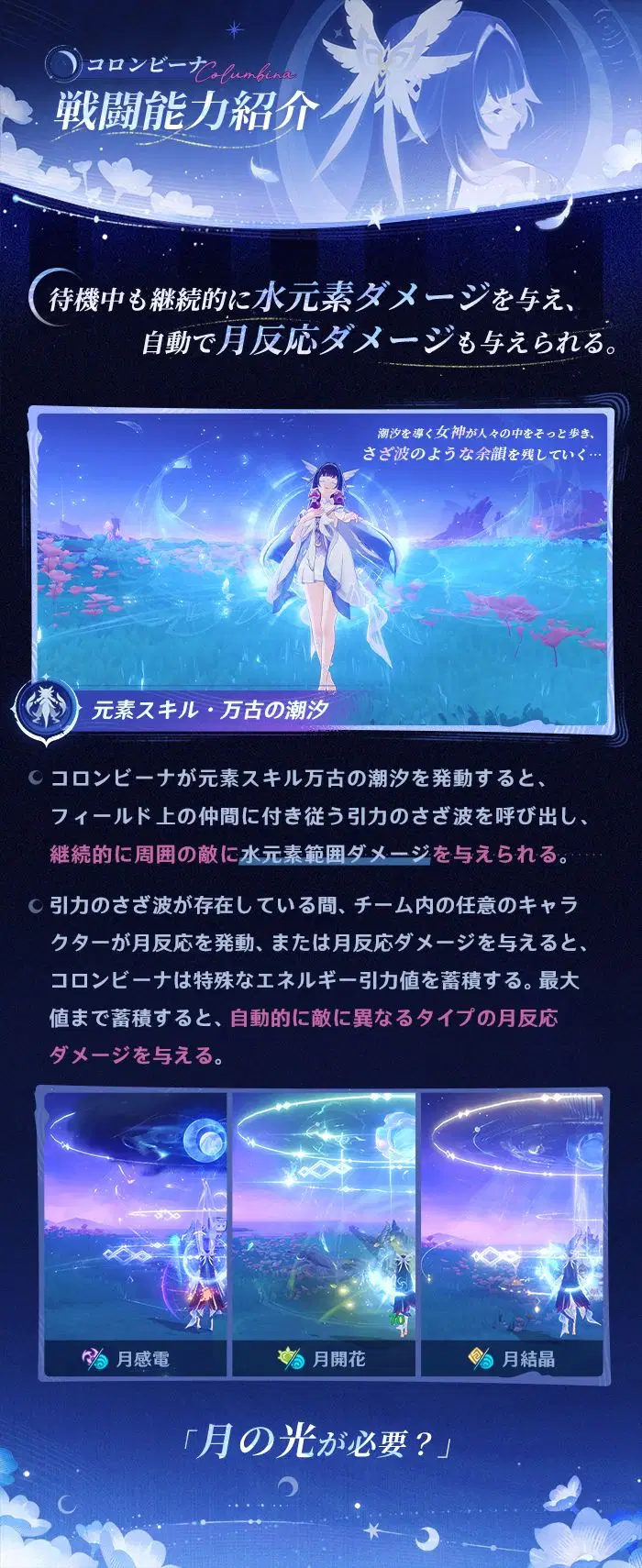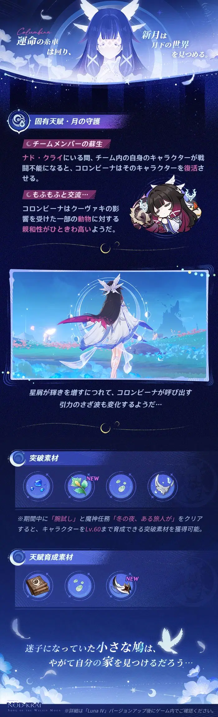 旅人さん、こんにちは!今回はコロンビーナのキャラクター能力紹介を一緒に見ていきましょう!イベント祈願「月と共に眠る」は「Luna Ⅳ」(1月14日)バージョンアップ後に開催され、「空月の帰郷・コロンビーナ」の出現確率が大幅にUPします!