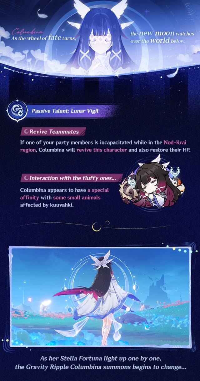 こんにちは、旅行者さん!コロンビーナのスキルショーケースはここにあります。一緒に詳しく見てみましょう!キャラクターイベントの願い事 "月からの夢" バージョンLuna IVアップデート後、1月14日に利用可能になります。 "ウェルキン・ムーンの帰郷" コロンビーナ(ハイドロ)のドロップ率が大幅にアップします! by genshinimpact
