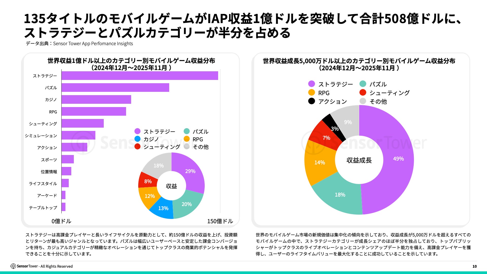 2025年には135タイトルのモバイルゲームがIAP収益1億ドルを突破し、その合計は508億ドルに達しました。ストラテジーは高課金プレイヤーと長いライフサイクルを原動力として、約150億ドルの収益を上げ、投資額とリターンが最も高いジャンルとなっています。パズルは幅広いユーザーベースと安定した課金コンバージョンを持ち、カジュアルカテゴリーが精緻なオペレーションを通じてトップクラスの商業的ポテンシャルを発揮できることを十分に示しています。