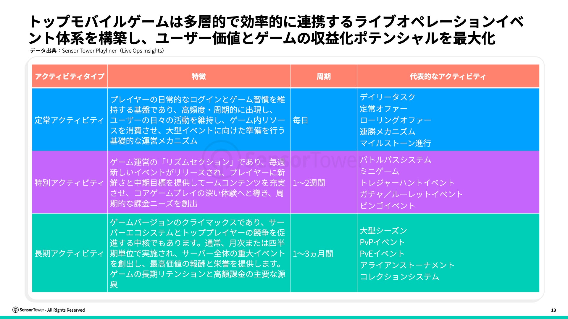 本レポートは、2025年世界の高収益モバイルゲームのライブオペレーション戦略に焦点を当て、トップパブリッシャーがアクティビティの連携、コンテンツの反復、深いインセンティブを通じて、市場のノイズを効果的に乗り越え、プレイヤーの注目と課金意欲を継続的に獲得する方法について詳細なインサイトを提供します。