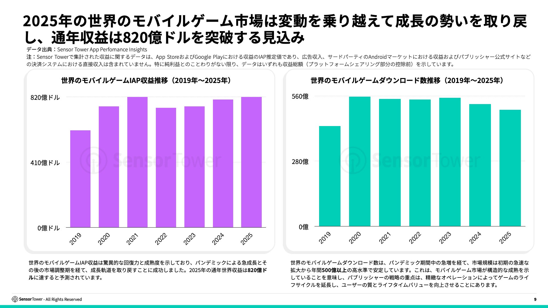 世界のモバイルゲームIAP収益は驚異的な回復力と成熟度を示しており、パンデミックによる急成長とその後の市場調整期を経て、成長軌道を取り戻すことに成功しました。2025年の通年世界収益は820億ドルに達すると予測されています。