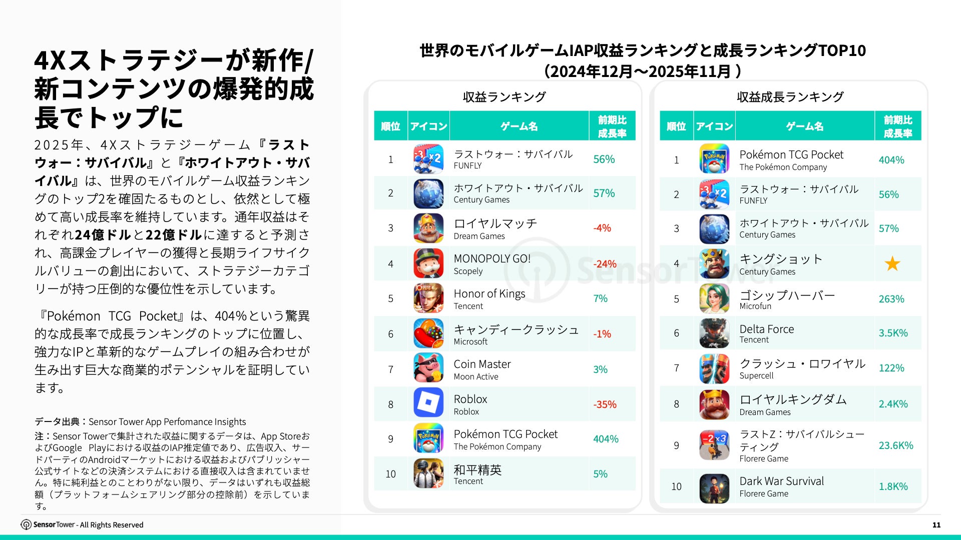 2025年、4Xストラテジーゲーム『ラストウォー:サバイバル』と『ホワイトアウト・サバイバル』は、世界のモバイルゲーム収益ランキングのトップ2を確固たるものとし、依然として極めて高い成長率を維持しています。通年収益はそれぞれ24億ドルと22億ドルに達すると予測され、高課金プレイヤーの獲得と長期ライフサイクルバリューの創出において、ストラテジーカテゴリーが持つ圧倒的な優位性を示しています。
