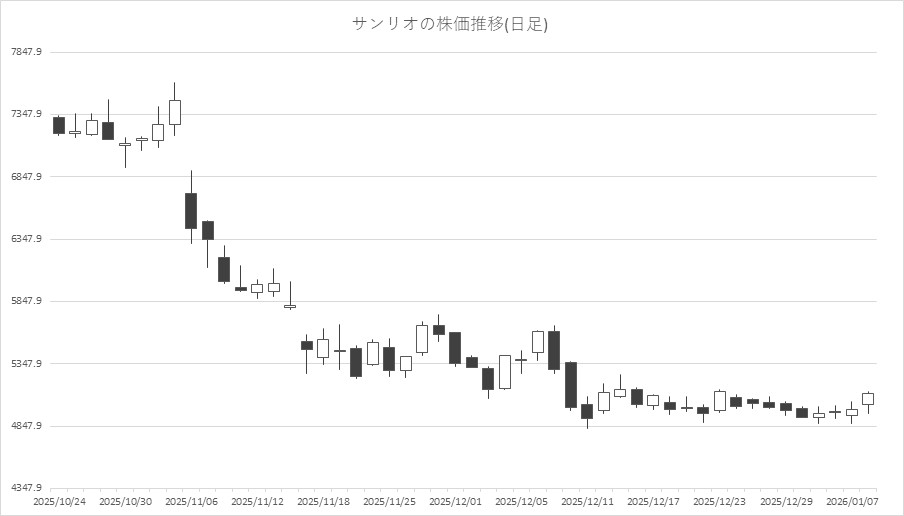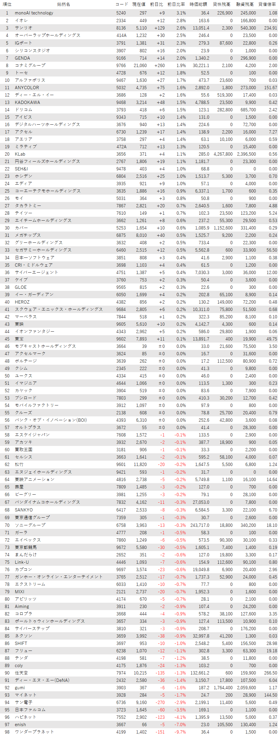 最後に騰落ランキングを見ると、monoAI technology<5240>やイオレ<2334>、サンリオ<8136>、オーバーラップHD<414A>、IGポート<3791>が値上がり率上位となり、ワンダープラネット<4199>、enish<3667>、ハピネット<7552>、日本ファルコム<3723>、サン電子<6736>が値下がり率上位となった。