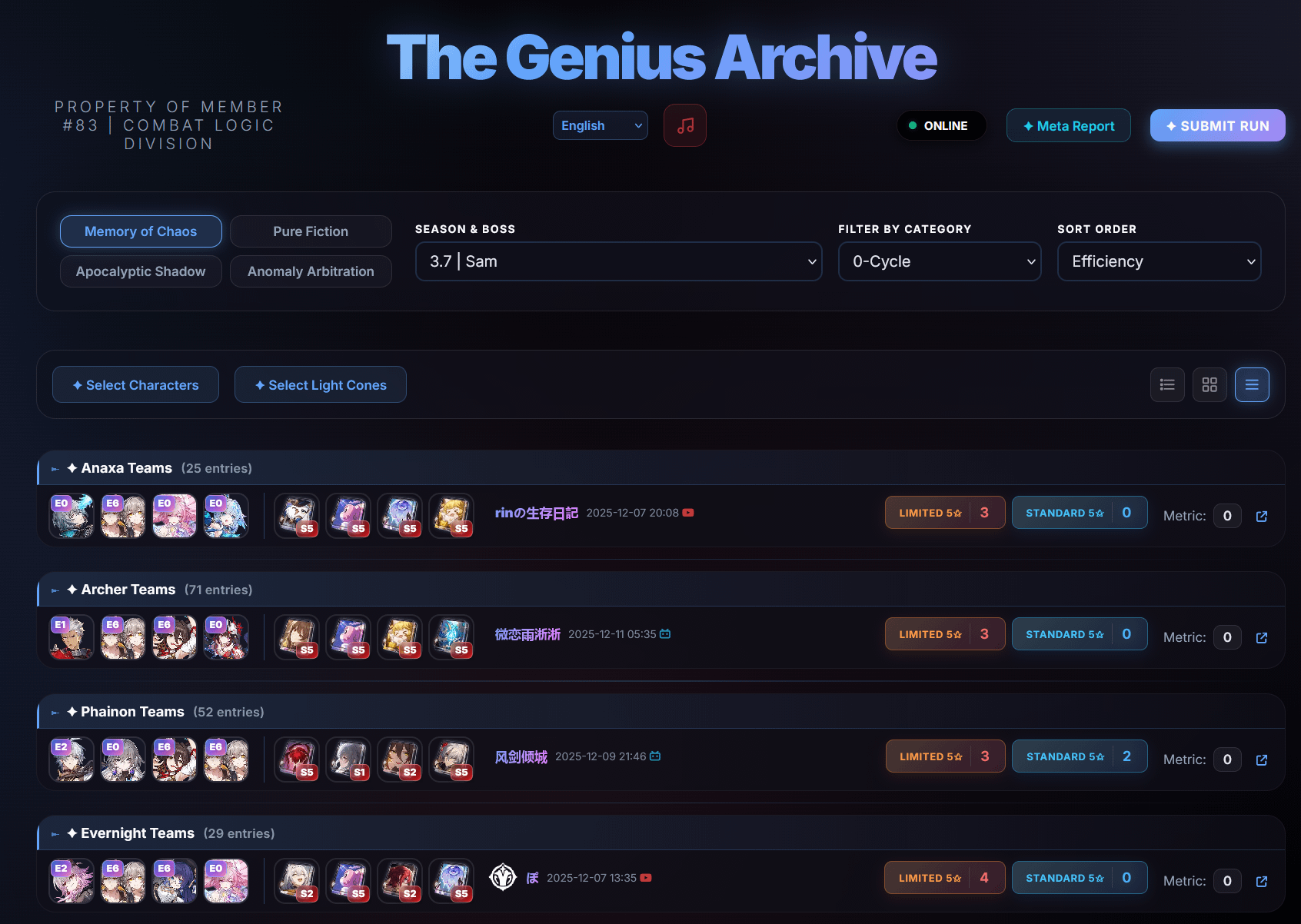 ウェブサイト には、Web サイトがダウンする前に tuopaimf にあったすべての実行のアーカイブがあり、チーム フィルタリングなどのオリジナルの機能のほとんどがそこにあり、将来的にはさらに多くの機能が追加される予定です。このサイトが永久に消滅しないように協力してくれた新月と他の数人の人々に感謝します。