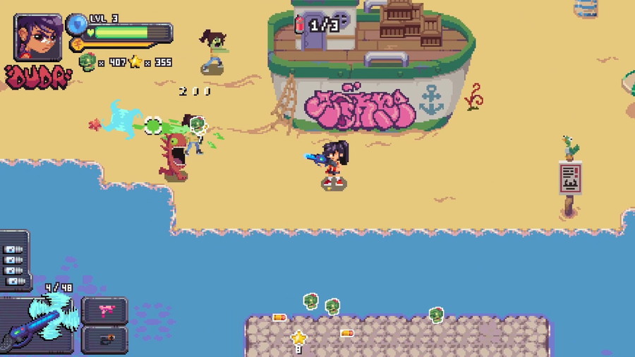 武器システムも本作の大きな魅力の一つで、ゲーム内にはカテゴリや特殊バージョンを含めると70種類以上に及ぶ武器が登場する。ケチャップブラスター、ガムシューター、爆発スプレーといったユニークで風変わりな武器の数々が、それぞれ独自の挙動とメカニクスを備えている。敵キャラクターとして登場するゾンビは20種類以上(計22体)で、その攻撃方法や行動パターン、変異形態は多岐にわたり、常に予測不能な戦闘体験を生み出す。