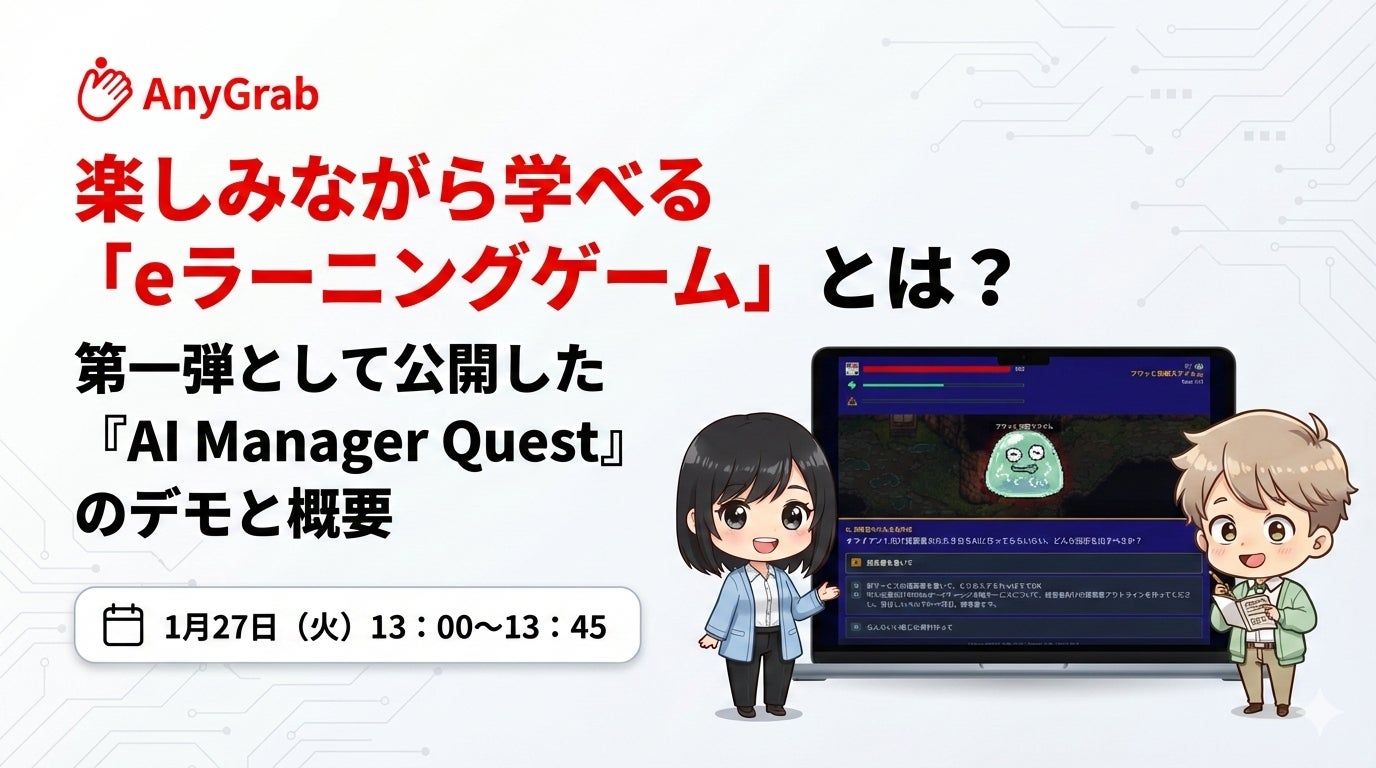 AnyGrab株式会社(本社:東京都渋谷区、代表取締役:菊池 芳朋、以下 当社)は、学ぶこと自体を“楽しい体験”に変える「eラーニングゲーム」の第一弾として、ブラウザで遊べる『AI Manager Quest』を本日より公開しました。レトロRPGのクエストを進めながら、生成AI活用で成果を左右する“伝わる依頼(指示の出し方)”の基礎(目的・ターゲット・出力形式・条件)を、実務シーンを題材に反復学習できます。