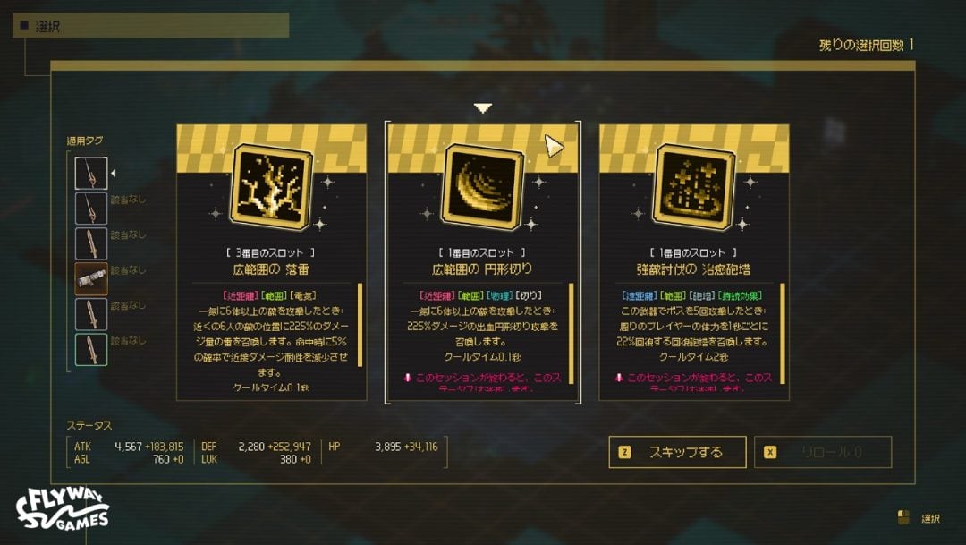 爆裂的なレベルアップと合わせ、一度のプレイで得た結果を、制限付きではありますが、恒久的に維持できるようにしました。ヴァンサバ形の特有の「ローグライクらしさ」は少し薄れましたが、代わりにRPG的な「永続的な成長」と「積み上げる達成感」を強調しています。アイテムを獲得するたびに数値が桁違いにインフレしていく快感……これは既存のサバイバー系とは一味違う面白さになっていると確信しています。