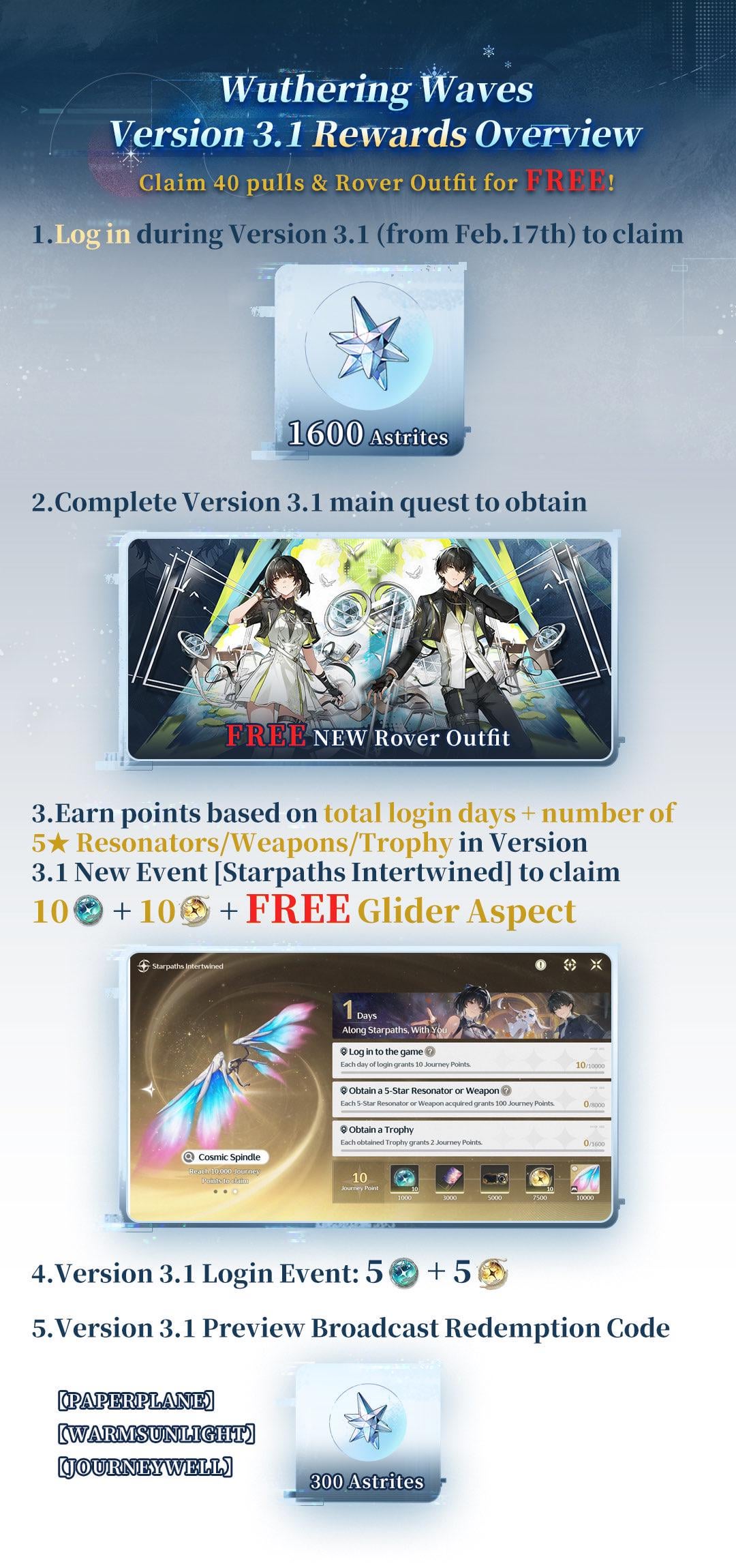 ローバーズさん、こんにちは。 嵐の波バージョン 3.1 が近日リリースされます。 バージョン 3.1 の無料で請求できる特典のインフォグラフィックをお届けします。 詳細については、(Wuthering Waves バージョン 3.1 プレビュー) をご覧ください。 https://wutheringwaves.kurogames.com/ja/main/news/detail/4082 by WutheringWavesMod