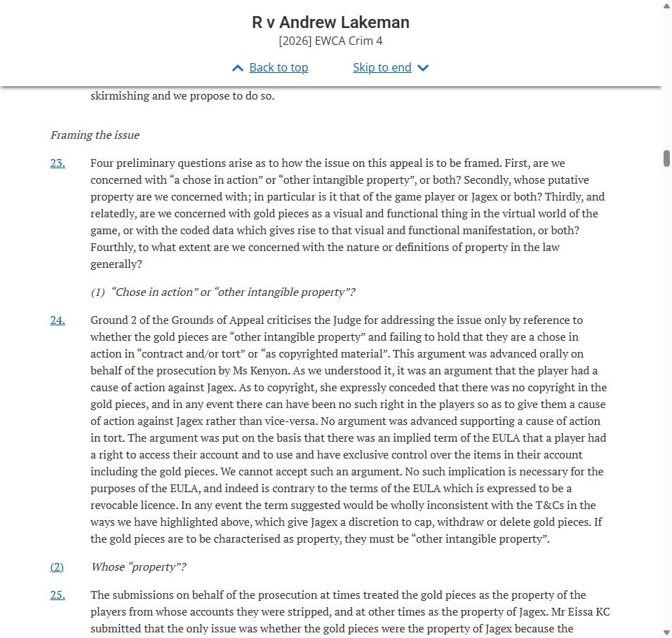 この事件は当初、刑事裁判として審理されたものの、第一審では起訴が退けられている。争点となったのは、ゲーム内ゴールドについて、英国の窃盗罪を定めたTheft Act 1968における「財産」に当たるかどうか、という点だった。第一審の裁判官は、『RuneScape』のゴールドについて、「誰かが持っているからといって、他の人が得られなくなるものではない」として、競合性がなく純粋な情報に近い存在だと判断した。