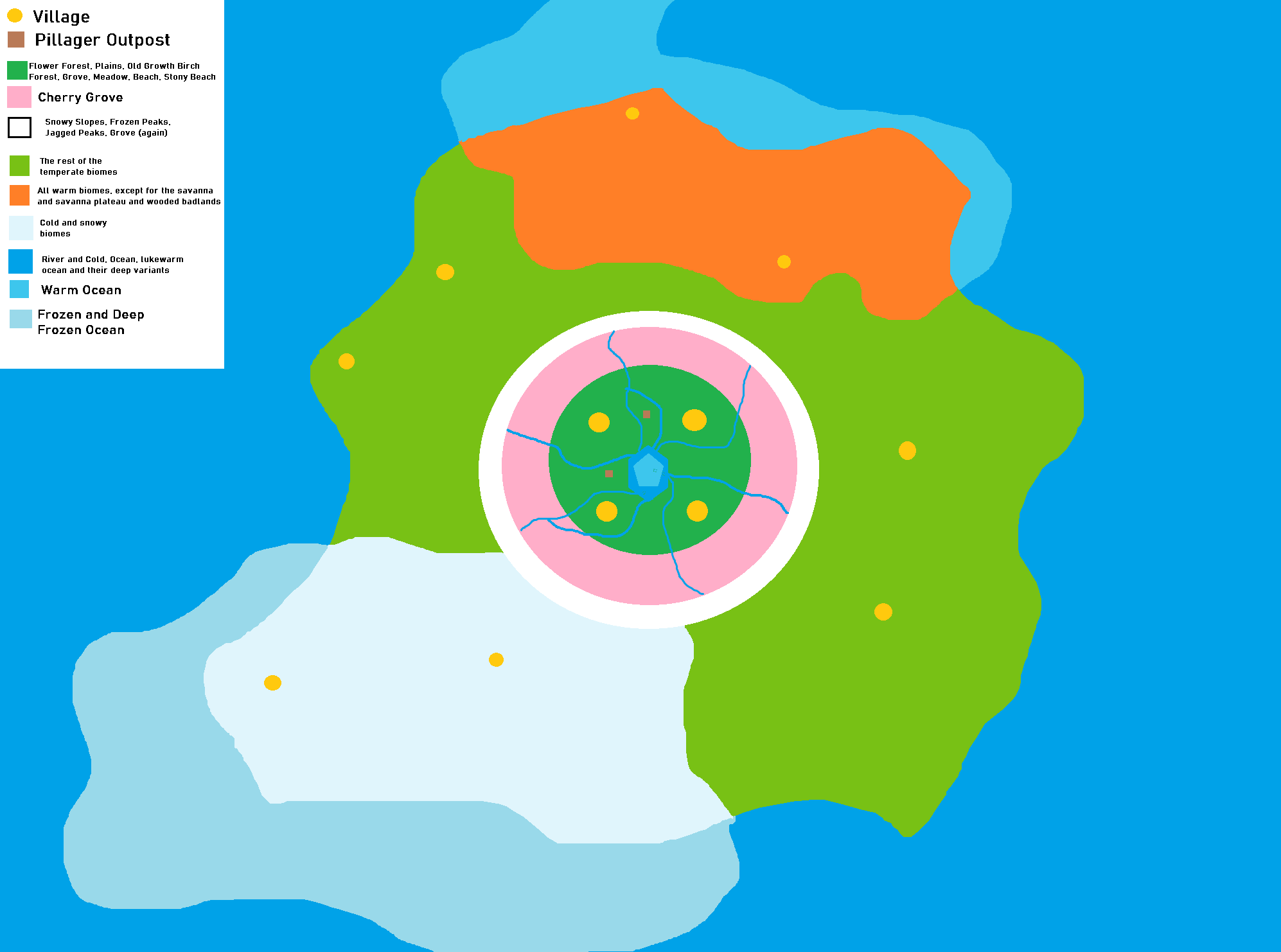 詳細を詳しく説明するとプロセスが長くなるため、これは曖昧なままにしました。大陸には4つの村の桜山サークルが必要です。 大陸のサイズは 2500、南北および西東に 500 ブロックプラスマイナスする必要があります。 明らかに、凡例 (?) に記載されている追加されないバイオームを除くすべてのバイオームが必要です。 また、大陸上で見つけられる/適合できる限り多くの構造物も必要です。 by No-Face-1692