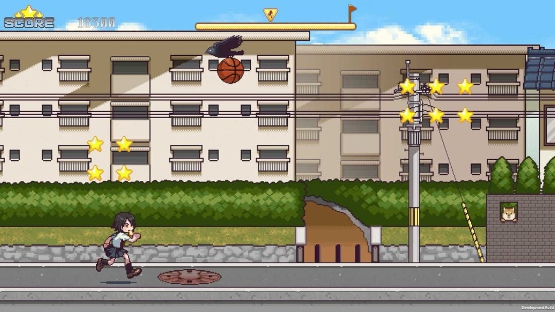 『PIXEL DASH: Toast of Destiny』は横スクロール型のアクションゲームだ。主人公は、ごく普通の女子高生「遙華ラン」。ランは修学旅行当日、旅先で運命の出会いを期待しながら出かける支度をしていたが、気付けば遅刻寸前の時間になっていた。食パンをくわえて家を飛び出し、今日も街中を疾走する。