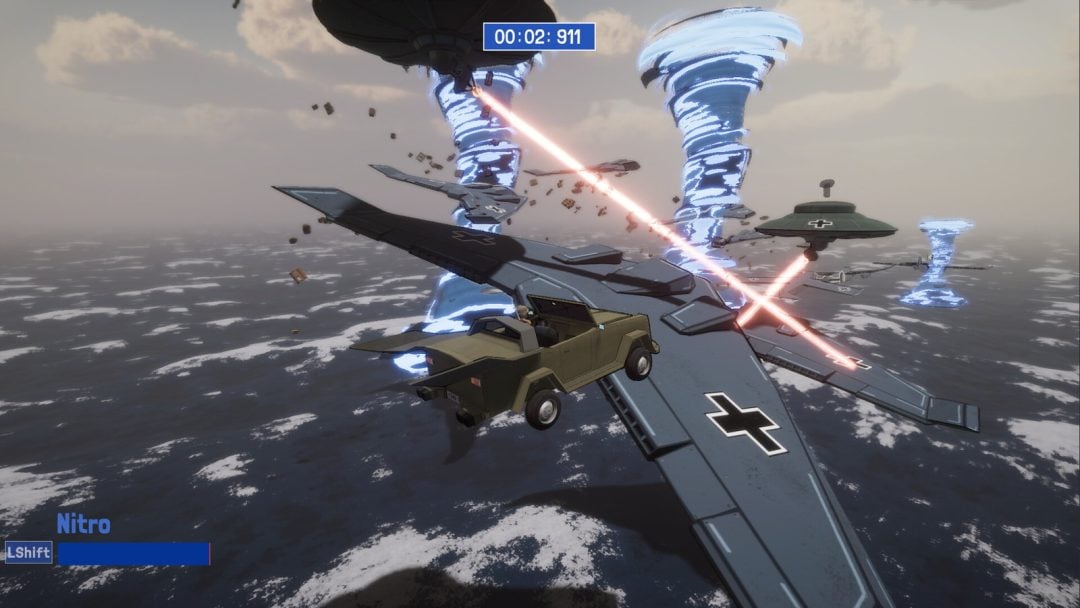 ゲームはステージクリア型のアクションゲームとなっている。ステージを開始すると、飛行機の上を車で走ることになる。編隊を組んで飛んでいる飛行機の上を次々と飛び移って、ゴール地点を目指すのだ。ジャンプ中には限られた量の「ニトロ」を使ってわずかながら推進力を得られる。飛行機同士の位置関係や、機体のうちジャンプ台として使えそうな箇所を見極めて、うまく助走をつけてニトロも駆使すれば、あたかも本当に飛んでいるかのような軌道で空を進んでいくことができるだろう。