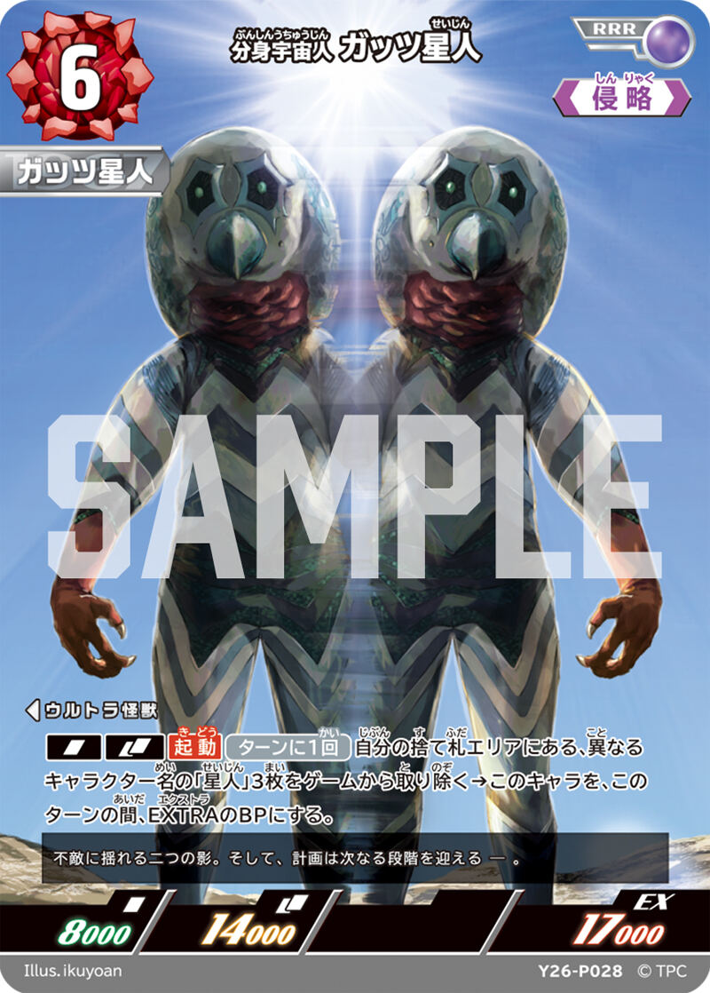 本製品では、ボックス購入特典としてPRカード「分身宇宙人 ガッツ星人」を封入。明るい青空を背景に、分身するその瞬間を描いた不気味ながら美しさも感じさせるイラストだ。