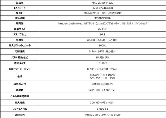 この度、エムエスアイコンピュータージャパン株式会社は2026年2月5日(木)より、ゲーミングモニターの新モデルを発売いたします。高いゲーミング性能とコストパフォーマンスに優れた『MAG』シリーズから、高精細なWQHD解像度のRAPID IPSパネル、リフレッシュレート200Hz・応答速度0.5ms(GTG、最小値)の高いゲーミングスペック、よりリアルな映像表現が可能なDisplayHDR 400に対応した「MAG 274QPF E20」が新たにラインナップに加わります。