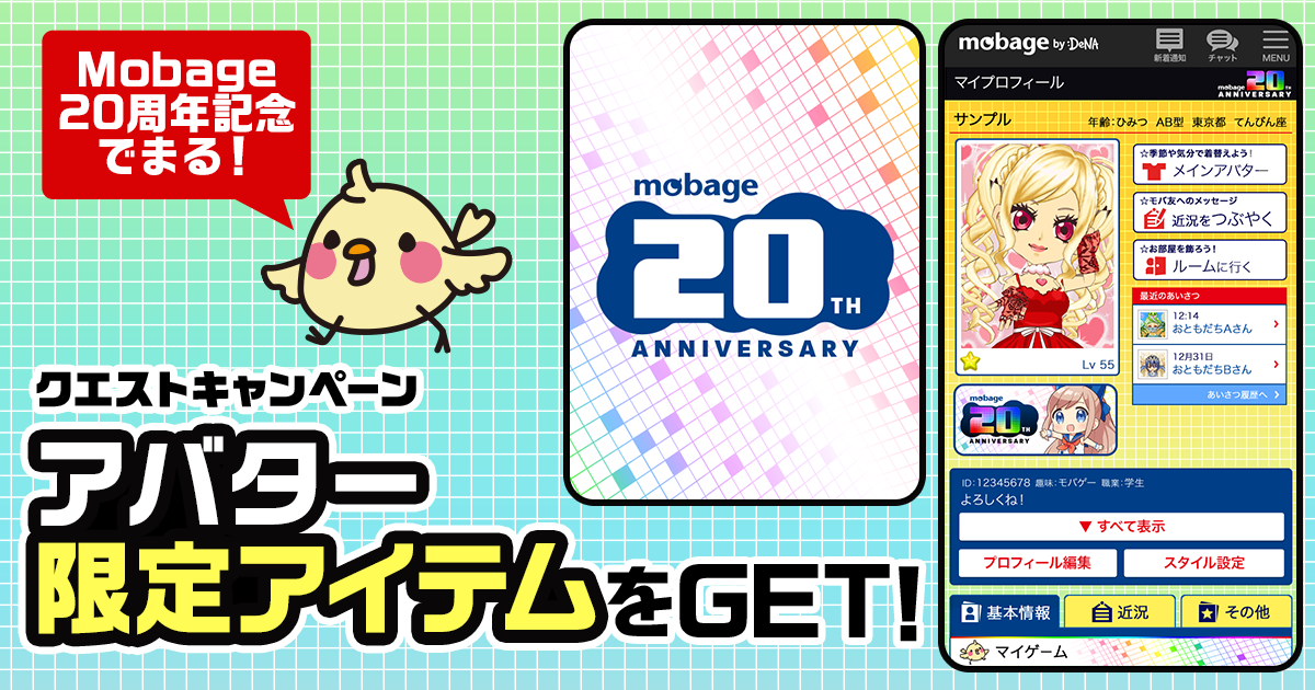 ●付与アイテム:Mobage20周年オリジナル背景アイテム、プロフィールスタイル