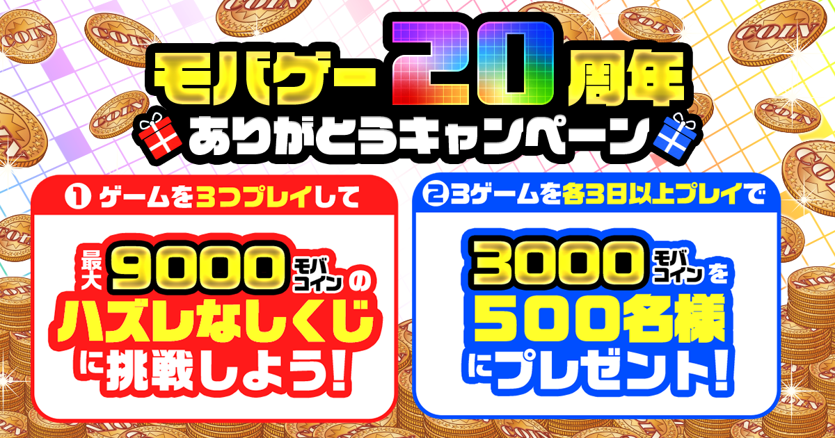 「モバゲー20周年ありがとうキャンペーン」と題してゲームを3タイトルプレイすると、最大9000モバコインがあたるハズレなしのくじびきにチャレンジできる企画と、3ゲームをそれぞれ累計3日以上プレイした方の中から抽選で500名様に3000モバコインをプレゼントする企画を実施します。