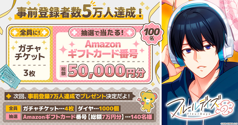 現在、事前登録キャンペーンを実施しており、5万人達成でガチャチケット3枚、7万人達成でガチャチケット計10枚と無償ダイヤ1,000個に加え、抽選で140名に総額7万円分のAmazonギフトカード番号が当たるキャンペーンが行われている。