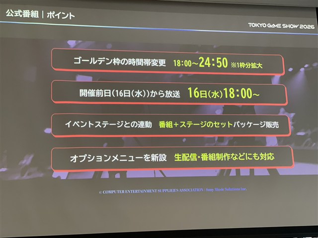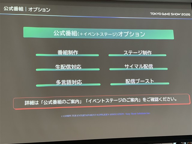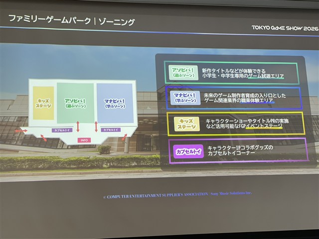 ここからは、ソニー・ミュージックソリューションズ・東京ゲームショウ事務局の森谷類氏が、公式番組・イベントステージ・ファミリーゲームパークについての発表を行った。