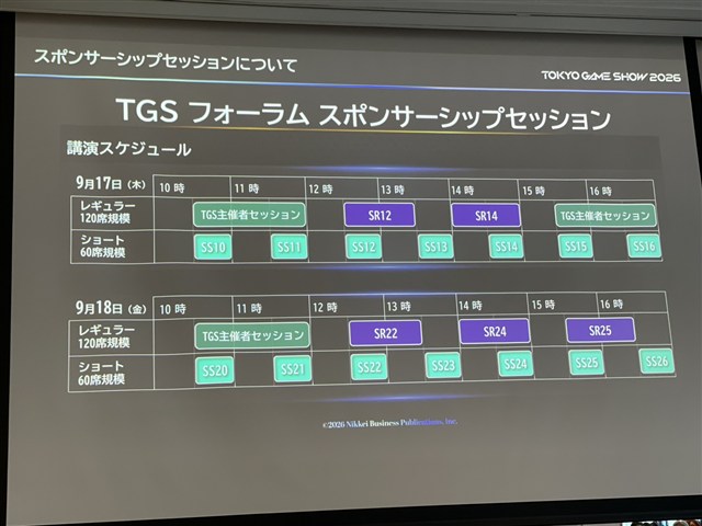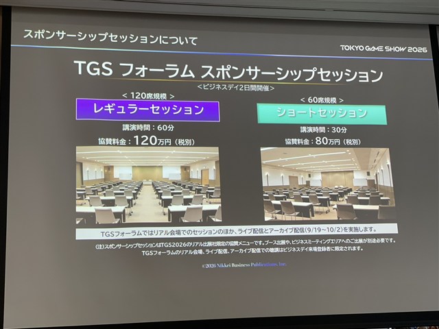 スポンサーシップセッションについては以下の通り。ビジネスデイの2日間、ゲーム産業の最新動向などにフォーカスしたセミナー・フォーラムを実施。メニューは会場規模や講演時間が異なる2つのタイプを用意しており、講演の模様はライブおよびアーカイブでも配信する。