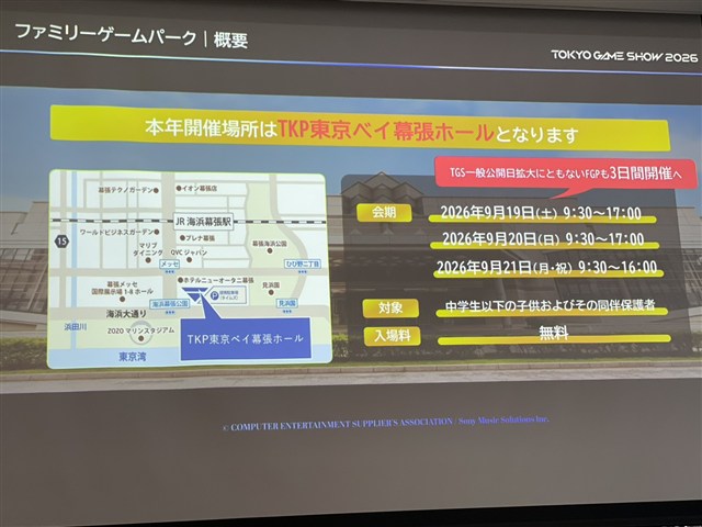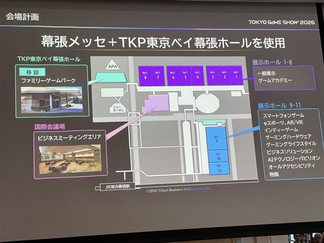 冒頭にも辻本氏から説明があった通り、「東京ゲームショウ2026」は一般公開日を1日増やし計5日間での開催を予定している。また、イベントホールの工事に伴い、ファミリーゲームパークをTKP東京ベイ幕張ホールに移設することになったと発表した。以下は本イベントの会場計画だ。