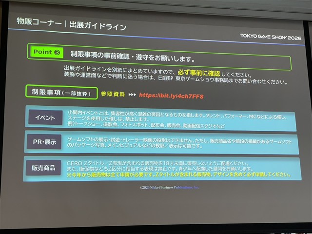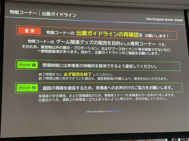 続いて、物販コーナーの出展ガイドラインについて。販売終了時間の厳守や混雑時の来場者への声掛けについて出展社に協力を呼び掛けた。また、本年より販売物には全て申請が必要になるとのこと。ブース設計前に物販コーナー出展ガイドライン資料を一読するよう念押しした。
