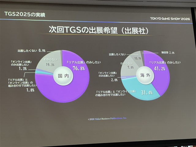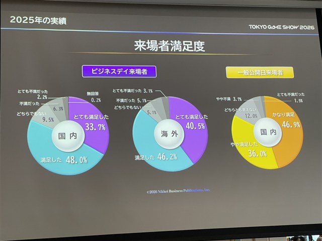 そのほか、出展社の満足度は国内、海外ともに70%以上が「満足している」と回答。来場者もビジネスデイ、一般公開日ともに80%以上が「満足した」との結果が出ており、次回(東京ゲームショウ2026)の出展や来場にも繋がっているようだ。
