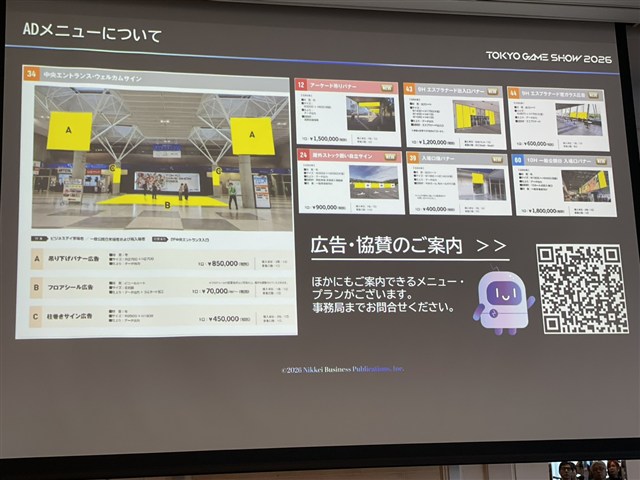 続いて、会場内の広告メニューを紹介。ADメニューについては、前年実績が優先される。優先期間は3月末までになっているとの話だった。