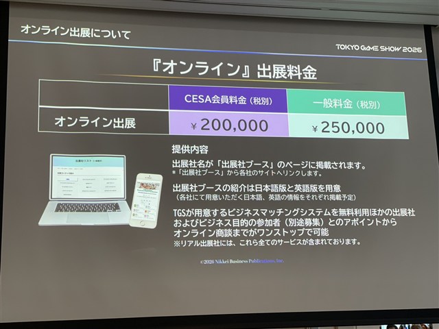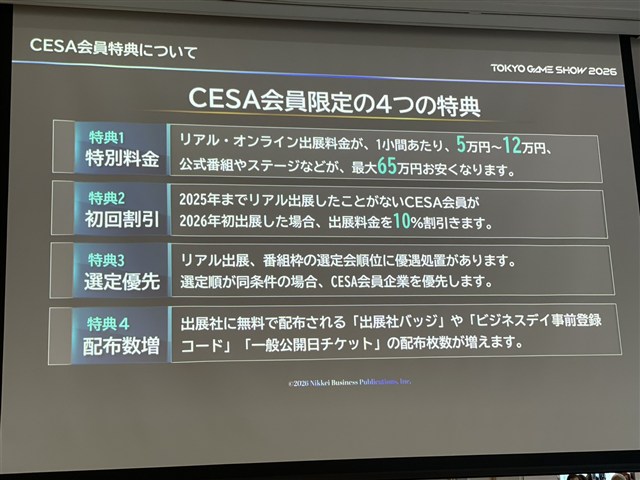 以下はCESA会員特典について。東京ゲームショウ2026の出展に間に合わせるためには、3月末を目途に事務局まで連絡してほしいと述べた。