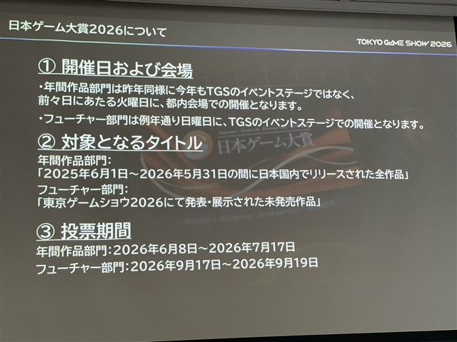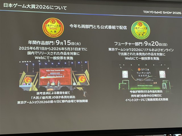 日本ゲーム大賞とは、一般社団法人コンピュータエンターテインメント協会(CESA)が主催する、プラットフォームの種類に制限を設けず、「公開」「公平」「公正」の精神に則り、優秀なコンピュータエンターテインメントソフトウェアを選考する表彰制度。年間作品部門として大賞、経済産業大臣賞、ゲームデザイナーズ大賞、特別賞、ブレイクスルー賞、ムーブメント賞などがあり、これとは別に東京ゲームショウ2026に出展された未発売タイトルを対象として表彰するフューチャー部門がある。