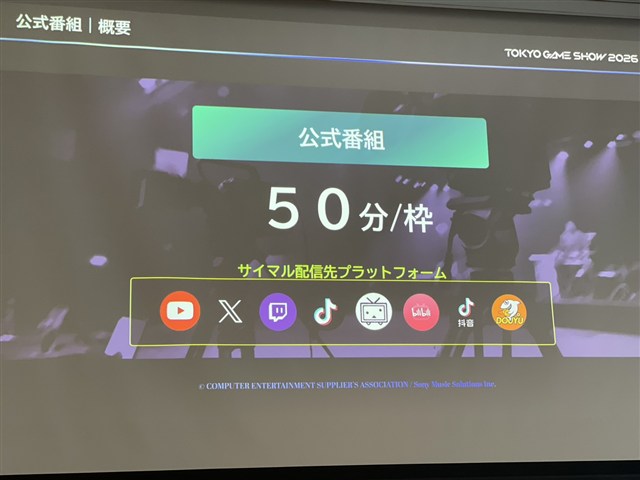 公式番組は、1枠あたり50分となっており、TGS公式YouTubeチャンネルをはじめ、計8つのプラットフォームで国内外に発信される。