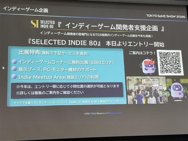 今年で19年目となる、インディーゲーム開発者支援企画のプレゼンテーションイベント「SENSE OF WONDER NIGHT 2026」を実施。「SELECTED INDIE 80」に選ばれた出展社に加え、インディーゲームコーナーの出展社もエントリーが可能となっている。