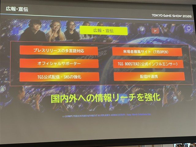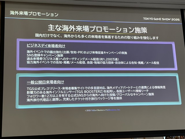 海外来場プロモーションについては以下の通り。これらの施策により、世界中のゲーム関係者、ファンにとって価値のある5日間を作り上げていくと展望を述べた。