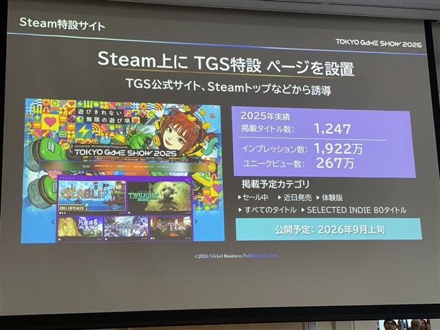 また、「東京ゲームショウ2026」開催にあたって、本日(2月10日)、ホテルニューオータニ東京 鳳凰の間にて、「東京ゲームショウ2026 開催発表会」を実施。当日は、今回で開催30周年を迎える「東京ゲームショウ2026」のテーマや全体の概要などが発表された。本稿では、本発表会の様子をレポートしていく。